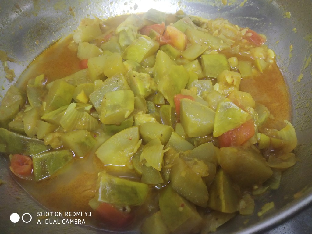 Many of us don’t have a recipe in mind. We just walk into the kitchen and use whatever we have to make something that our imagination can. This is plain bottlegourd with potatoes and tomatoes…