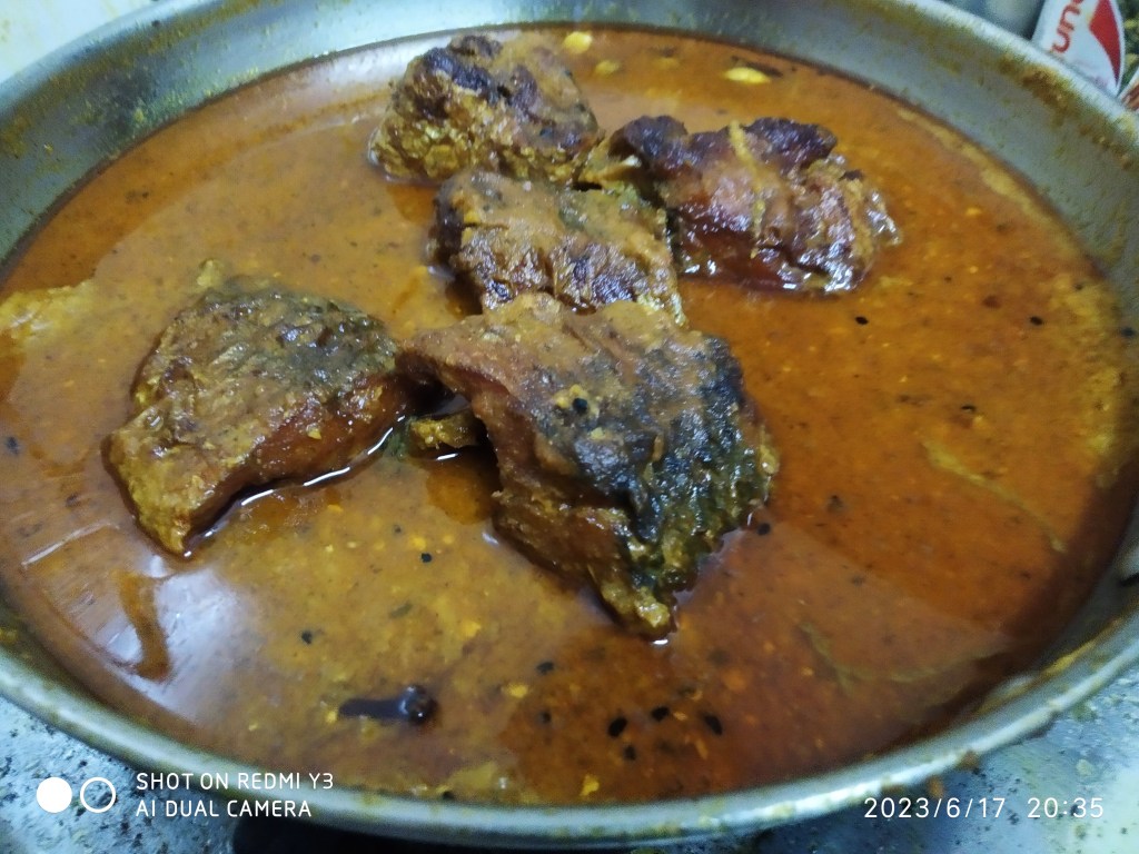 Use the oil you used to fry the fish. Add the mixture and cook till the spices release aroma. Then add some water and salt and cook for some more time.