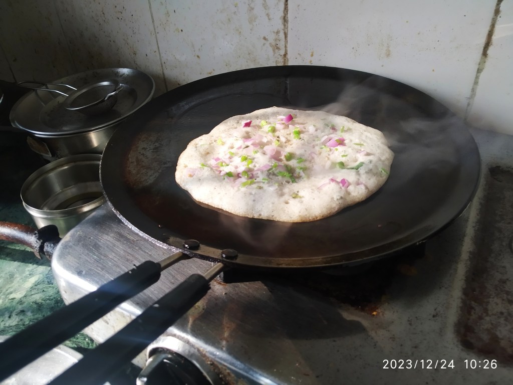 Now take a flat iron pan. Heat the pan and add some oil. When the oil is absorbed by the iron tawa, sprinkle some water and and allow the water to evaporate. Then pour the batter and spread it. This needs practice.
