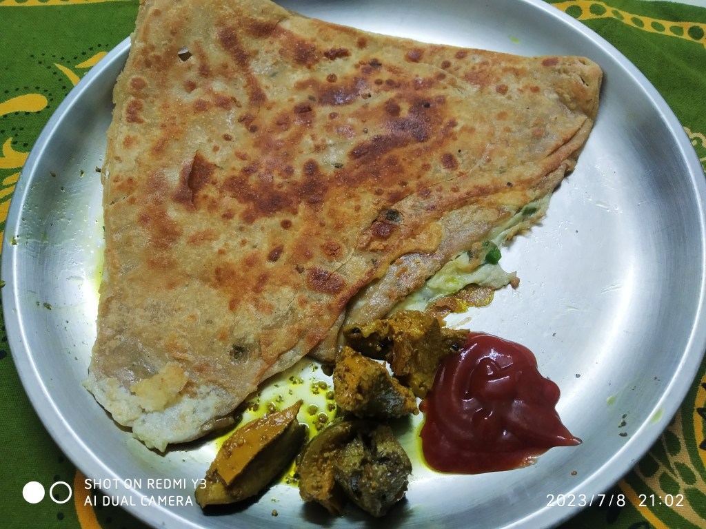 Then you need to roll the paratha in triangular shape. This rolling is a bit tricky. First, cook without oil. Then open the paratha and pour the egg mixture in it and fry it.
