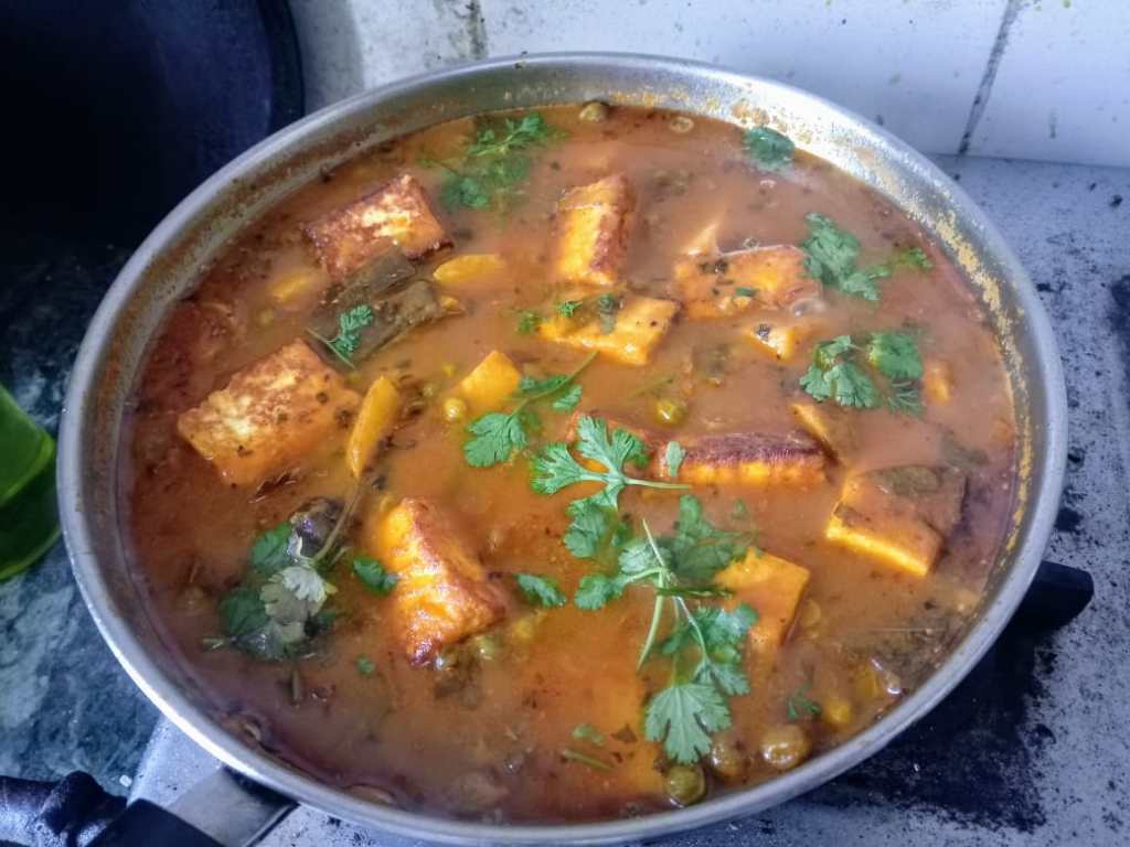 Heat oil in a pan and fry the mixture. Then add the peas. When oil separates add the paneer pieces and cook until the paneer pieces have turned slightly brown.