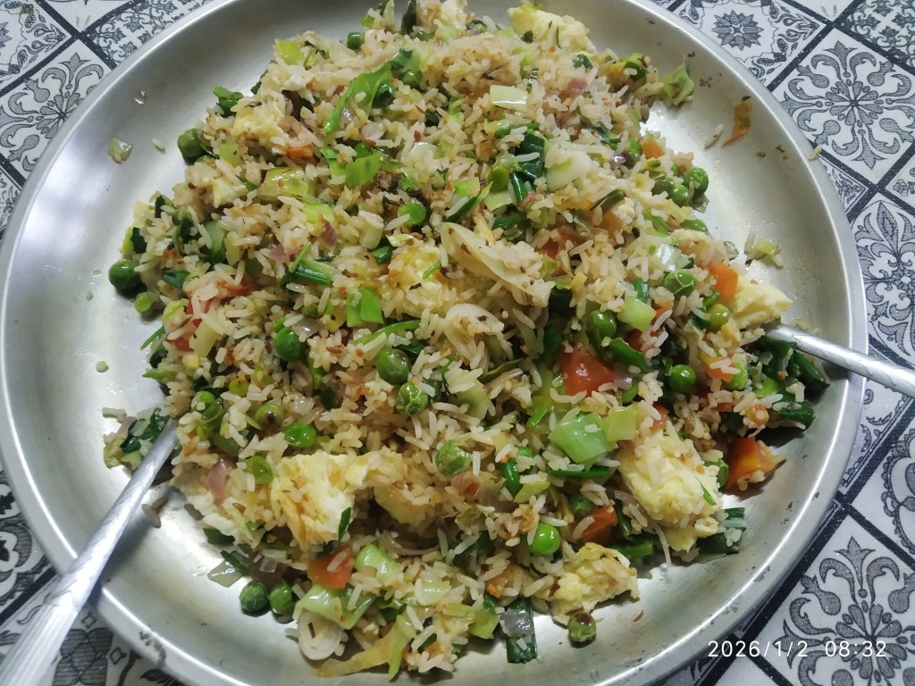 Many people may say it is refined carb etc. but that’s what we eat in our everyday life. Fried rice with vegetables and eggs. It’s a feel good food, not do dangerous if we care to work out.