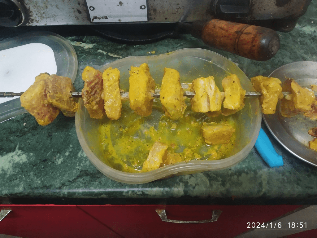 We marinated the fish for few hours with red chilli powder, turmeric, salt and vinegar. Yes put it in the oven. It is that easy to make.